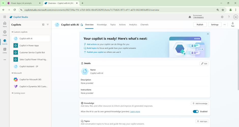 - Once done, we can Publish the Co-pilot and Proceed to Test.