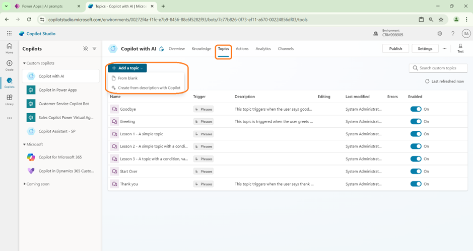 - Create a new Topic. We can Start from a blank or can also describe to Copilot which helps in creating the skeleton.