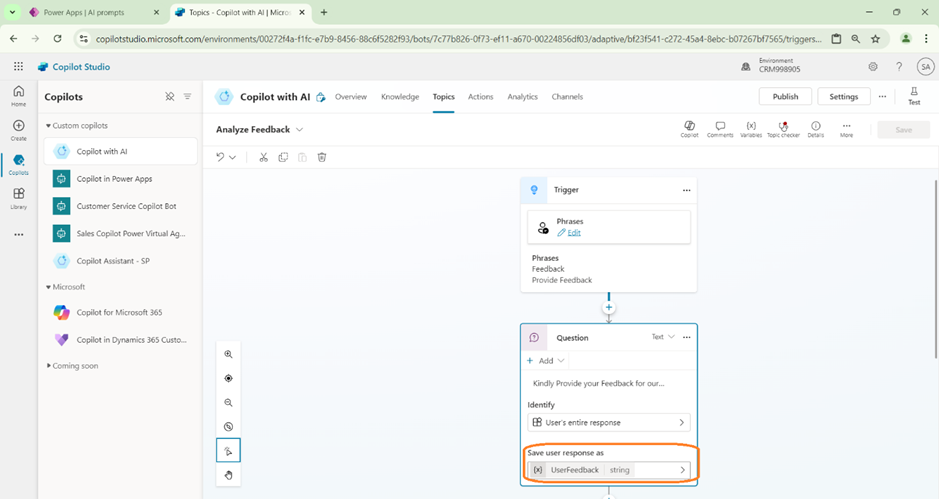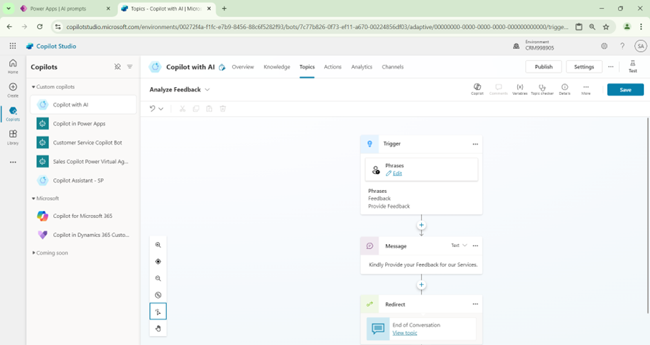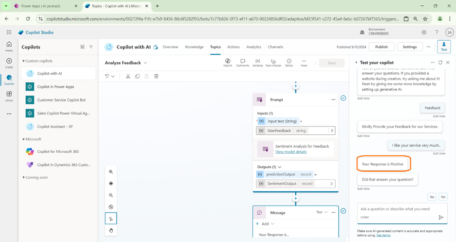 - Trigger the Co-pilot topic by prompting Feedback. Then provide a Positive or Negative comment.