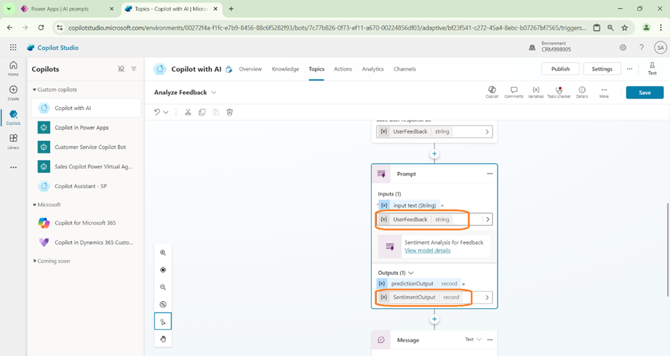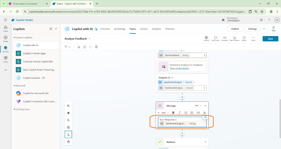 - The Response from the AI builder is stored in another variable (in this case we define as SentimentOut).