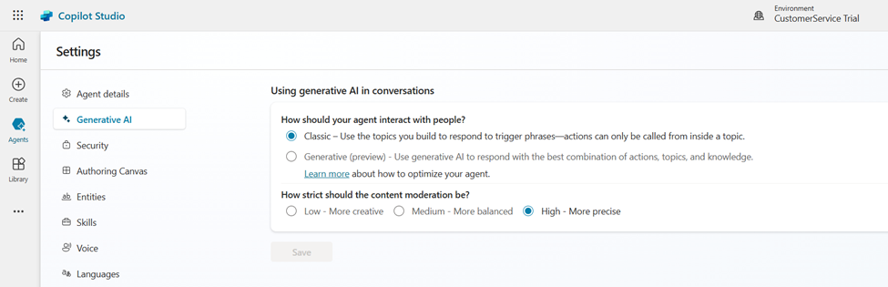 - We need to Enable the Generative (preview) option which uses the Gen AI to respond with the nest combination of Actions, topics and Knowledge.
