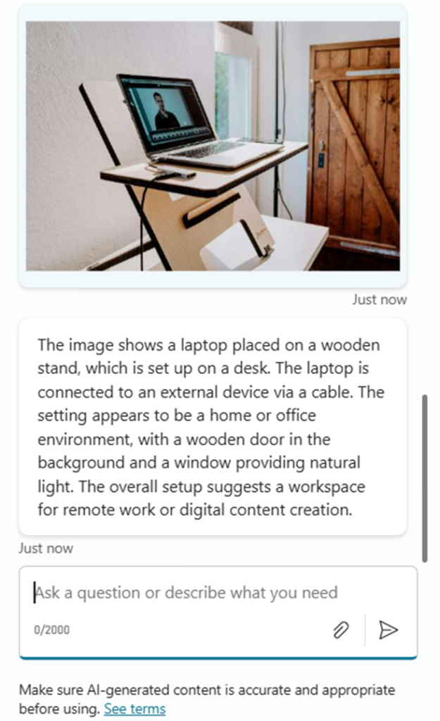 - Just to check in a different way, I’m using an image with no Text and asking the Agent to describe it.