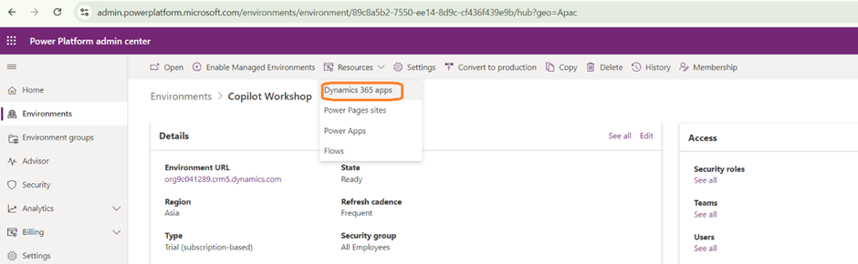 - Go to Power Platform Admin Centre -> Resources -> Dynamics 365 apps.