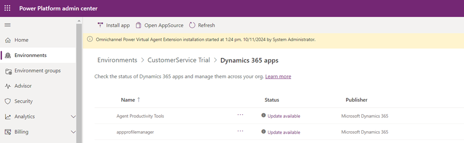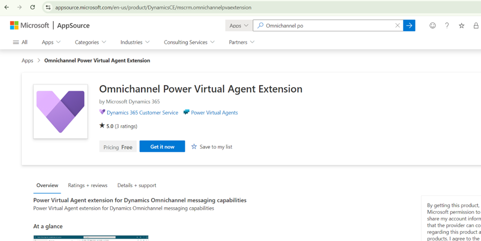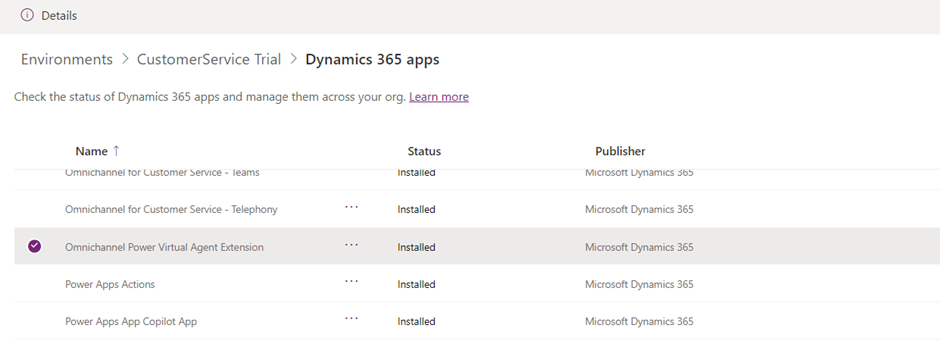 - Check for the app – Omnichannel Power Virtual Agent extension.