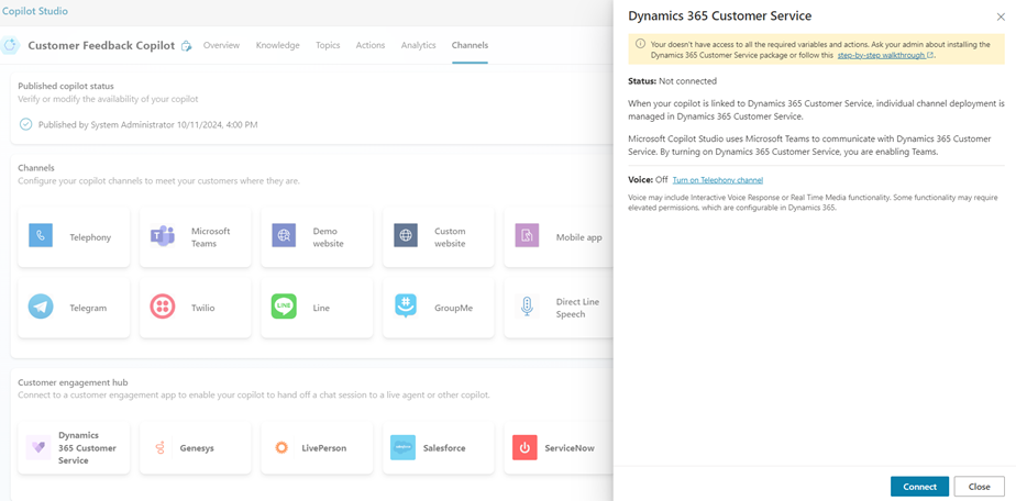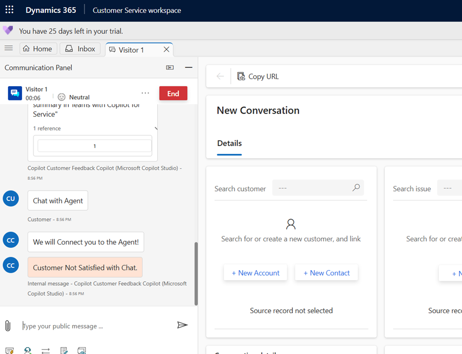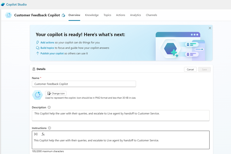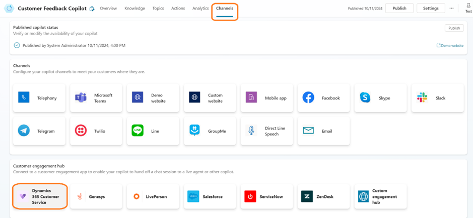 - Once done, the steps are completed. We have successfully configured the Copilot chatbot to handoff to the D365 Customer Service.