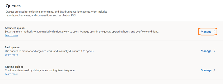 - From the Advanced queues section, click on Manage.