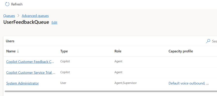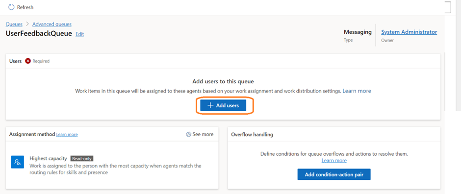 - Once the queue is created, it will take us to the newly created queue page. Click on Add Users to add the Human Agent as well as the Copilot to the Queue.