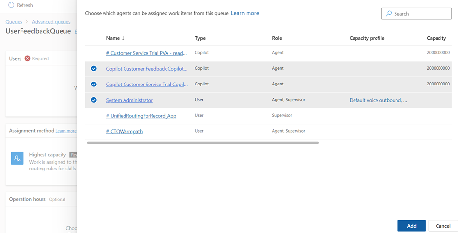 - Select the human agent user as well as the Copilot agent instance and click on Add.