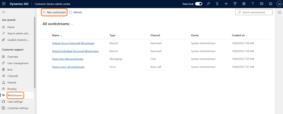 - Now let’s create a Workstream. A workstream is nothing but a container to route, and assign work items. From the Workstreams tab in the left pane, click on New Workstream.