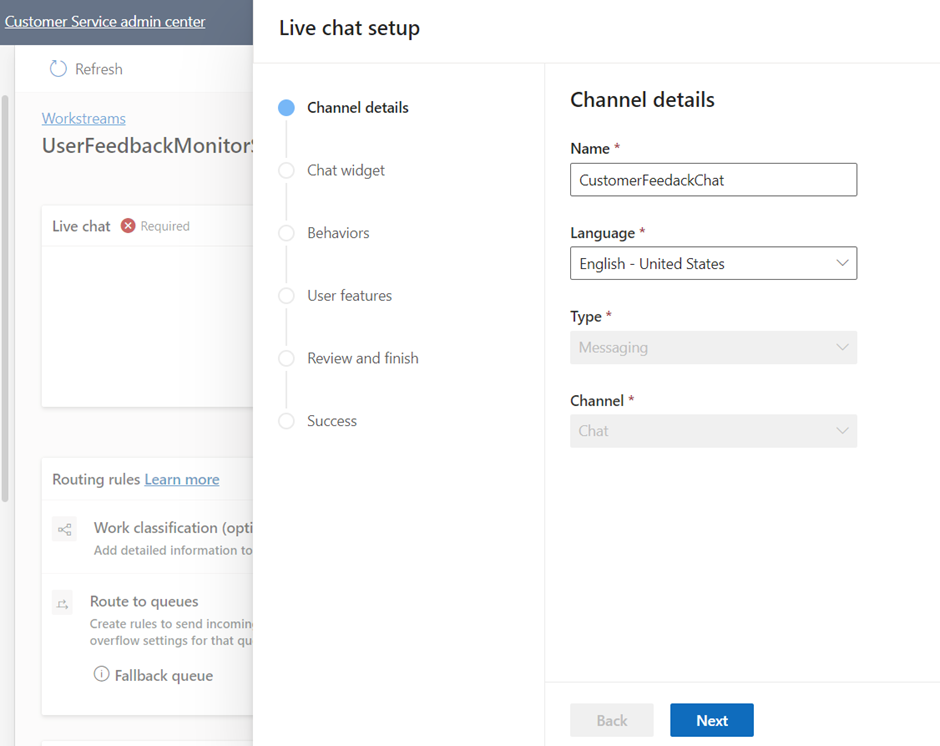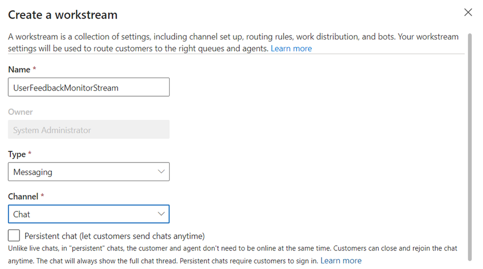 - Specifying the workstream name, Type as Messaging and the channel type as Chat.
