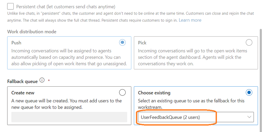 - Select the work distribution mode as Push so that when a conversation comes, it is auto assigned to agents based on capacity and presence.