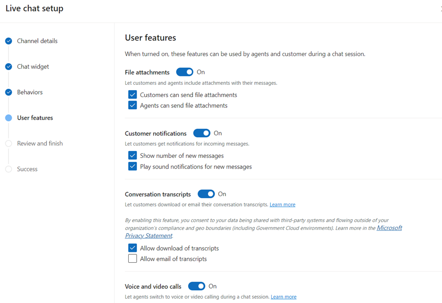 - We will retain the chat channel behavior parameters with default values and click on Next.