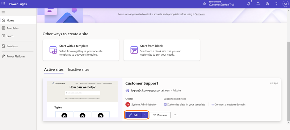 - For this demo, we have created a Power Pages portal using the existing available Template.