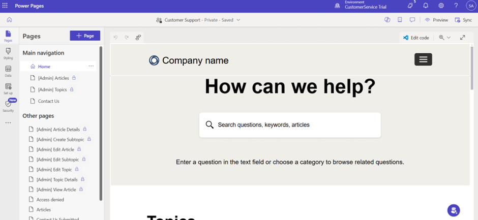 - The Power Pages maker window appear as shown below.
