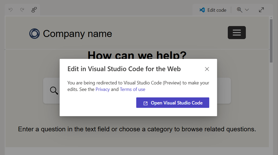 - Click on Edit code Will ask us permission to Edit the portal site inside the Visual Studio Code online. We don’t need to have a separate App version installed in our local system.