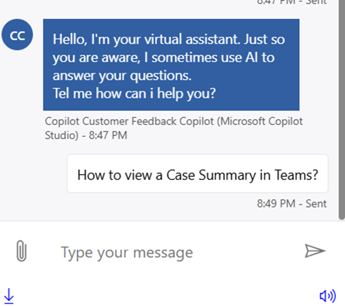 - We can ask a Sample Question based on the Knowledge Source specified. In this case im just asking – How to view a Case Summary in Teams?