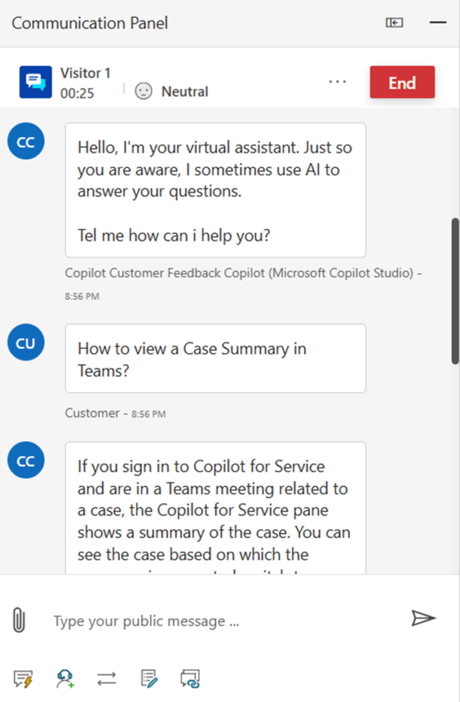 - The panel also provides the History of the conversation between the User and the Copilot chatbot, so that Agent gets the full understanding on the Chat History.