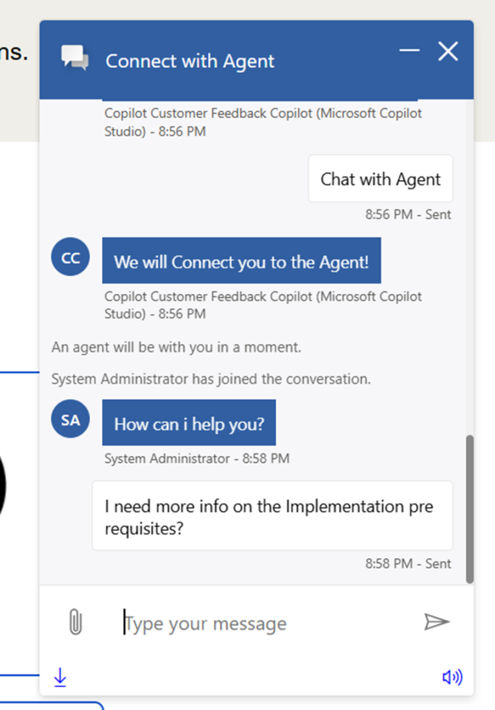 - Copilot can understand that user needs to talk to Live agent and prepares for Handoff since we have already configured the Topic