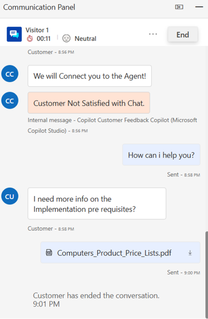 - Once the Customer ends the conversation, the Live Agent using the Customer Service App also gets notified.