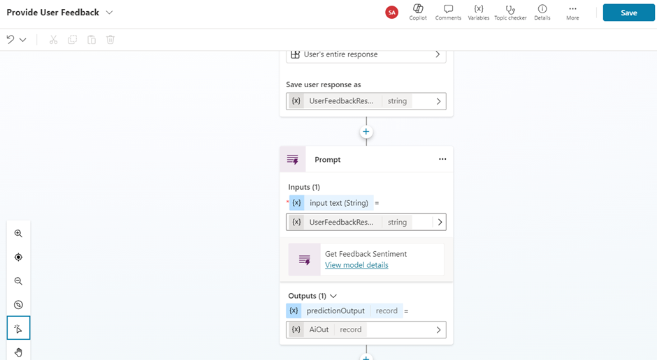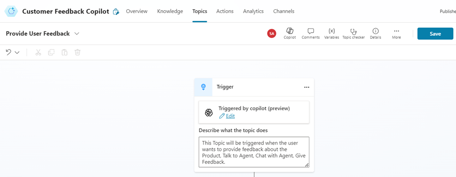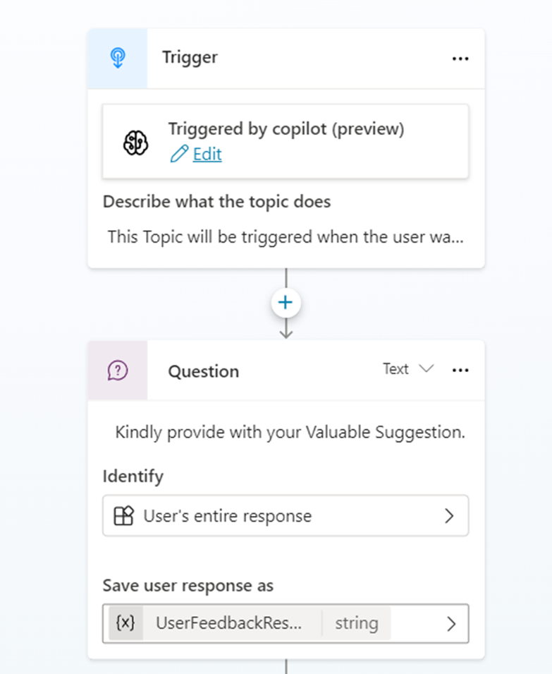 - After providing a proper description about the Topic, we can insert a Question node that gets the User Feedback as Input.