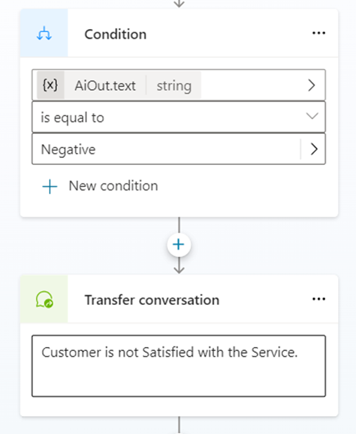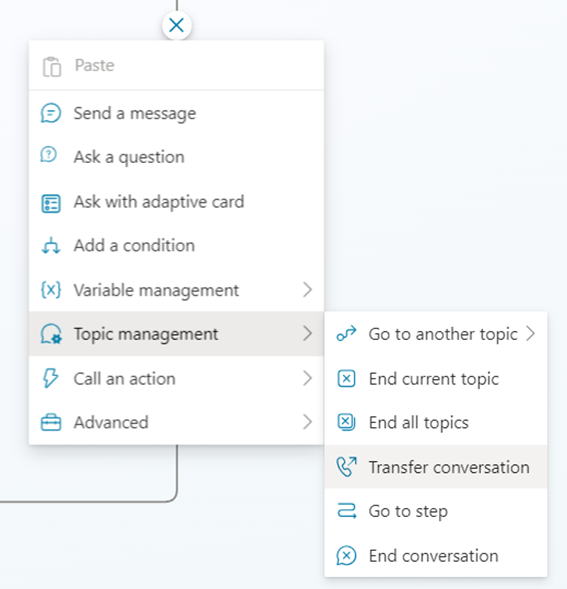 - Below the message node, select the Add node icon , point to Topic Management, and select Transfer conversation.